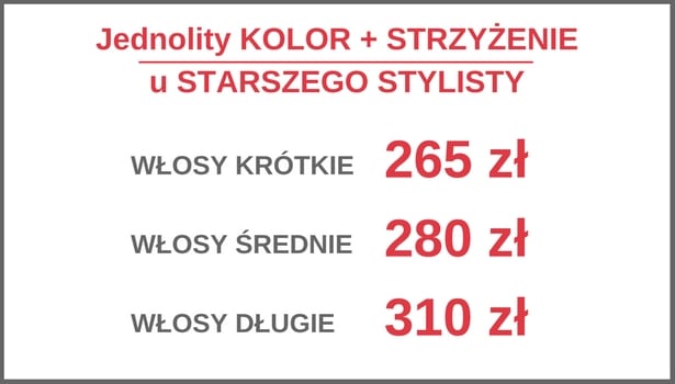 Dodatkowo rezerwując u nas wizytę w salonie u Starszego Stylisty na jednolitą koloryzację ze strzyżeniem będziesz pewna, ile zapłacisz – Cena Cię nie zaskoczy – a Twoje włosy będą miały rewelacyjny kolor, idealną formę i zdrowy, lśniący wygląd!